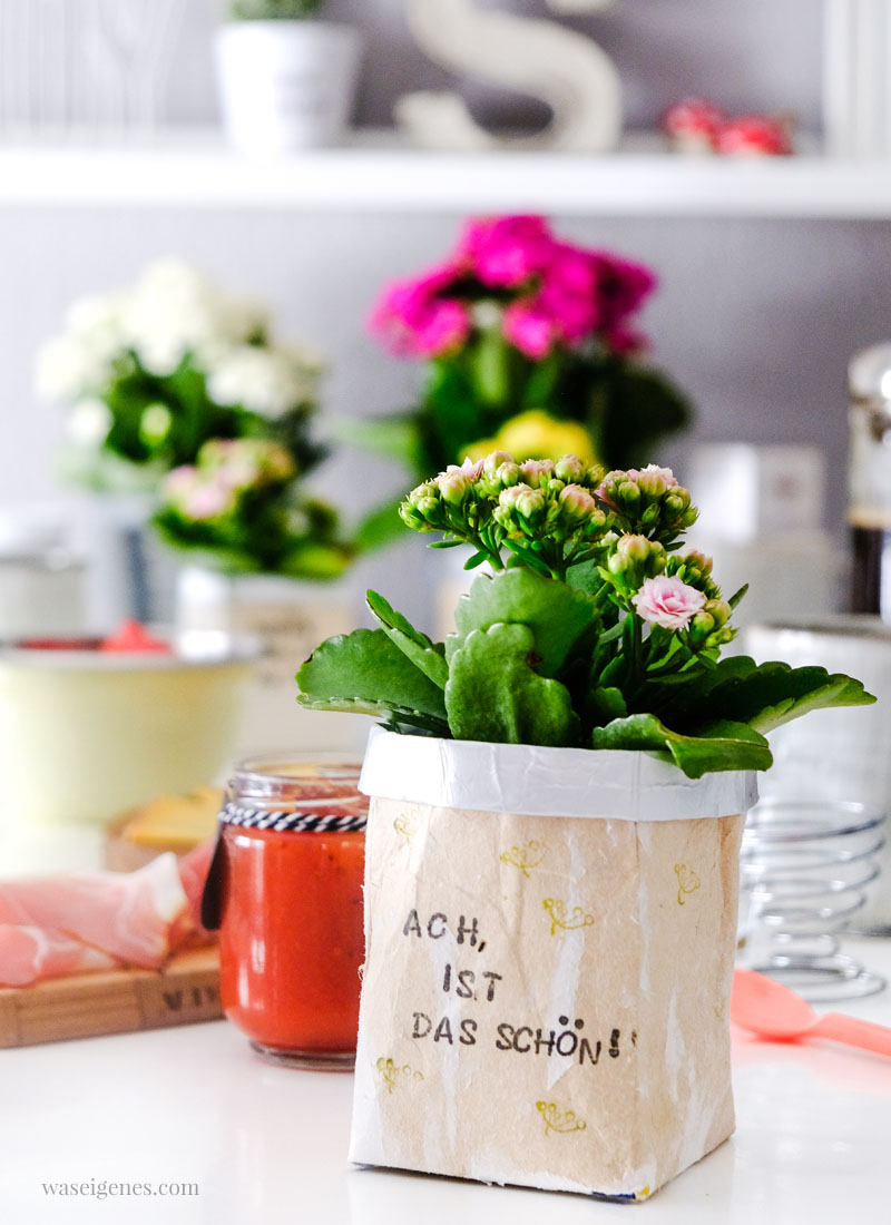Die Kalanchoe gibt es übrigens nicht nur in diesem Mini-Format, nein, Ihr könnt auch große, farbenprächtige Sorten kaufen. Die passen allerdings nicht in eine recycelte Milchtüte, machen sich aber auch gut in einem richtigen Blumentopf oder eben bis Mitte September im Blumenbeet oder auf dem Balkon. Kommt der Frost, ist draußen leider Schluss damit.