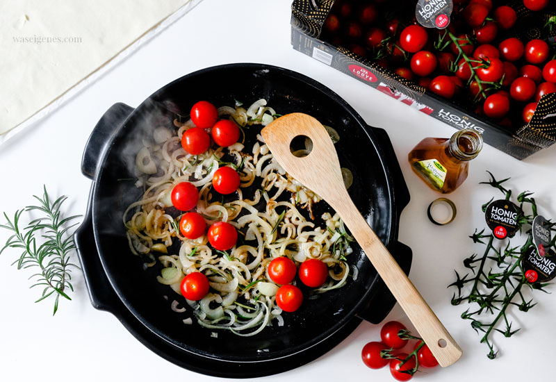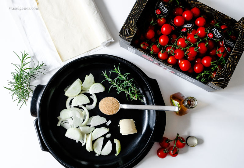 Das Obst – oder wie in diesem Falle: die Honigtomaten – werden zunächst in der Pfanne mit karamellisierten Zwiebeln, Rosmarin und einem Schuss Essig angebraten, mit Blätterteig zugedeckt und kommen dann direkt so in den Ofen.