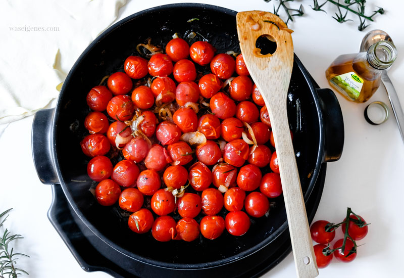 - Sobald die Tomaten ein wenig aufgeplatzt sind, die Pfanne vom Herd nehmen.