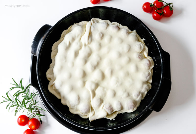 Den Blätterteig rund ausschneiden und damit die Tomaten zudecken.