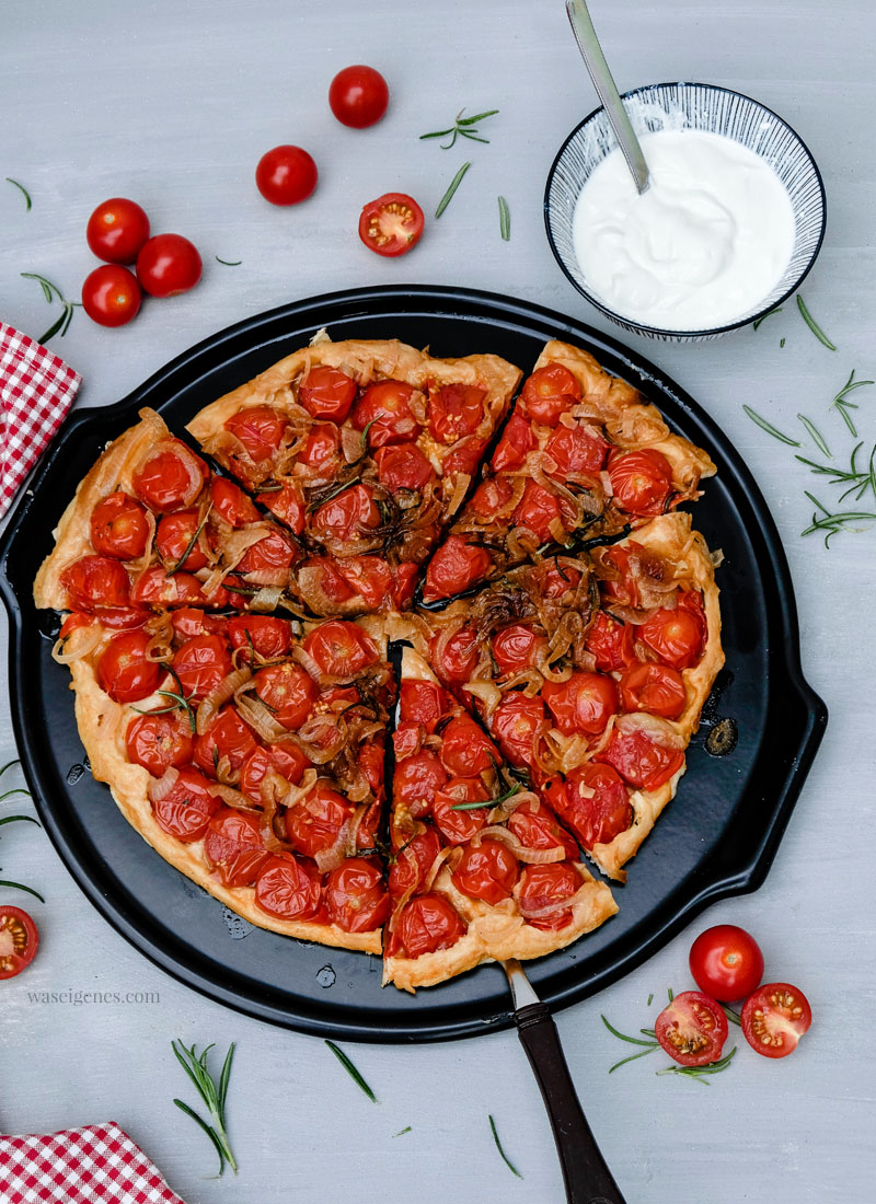 Kurze Unterbrechung meiner Apfel-Fanatsien, aber auch nur so halb, denn ich habe einen traditionell französischen Apfelkuchen kurzer Hand zu einer Tomaten-Tarte umfunktioniert – mit karamellisierten Zwiebeln, feinem Rosmarin und einem Klecks Ziegenfrischkäse. Das Ergebnis: Schmeckt fantastisch!