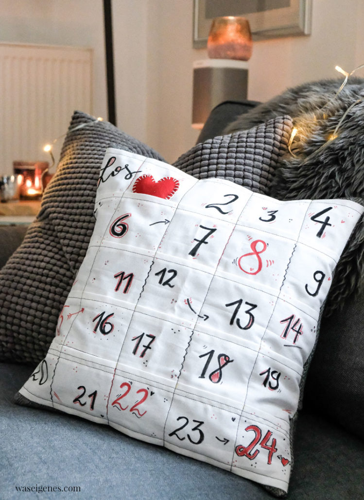 - ein genähtes Adventskalender Kissen gezeigt