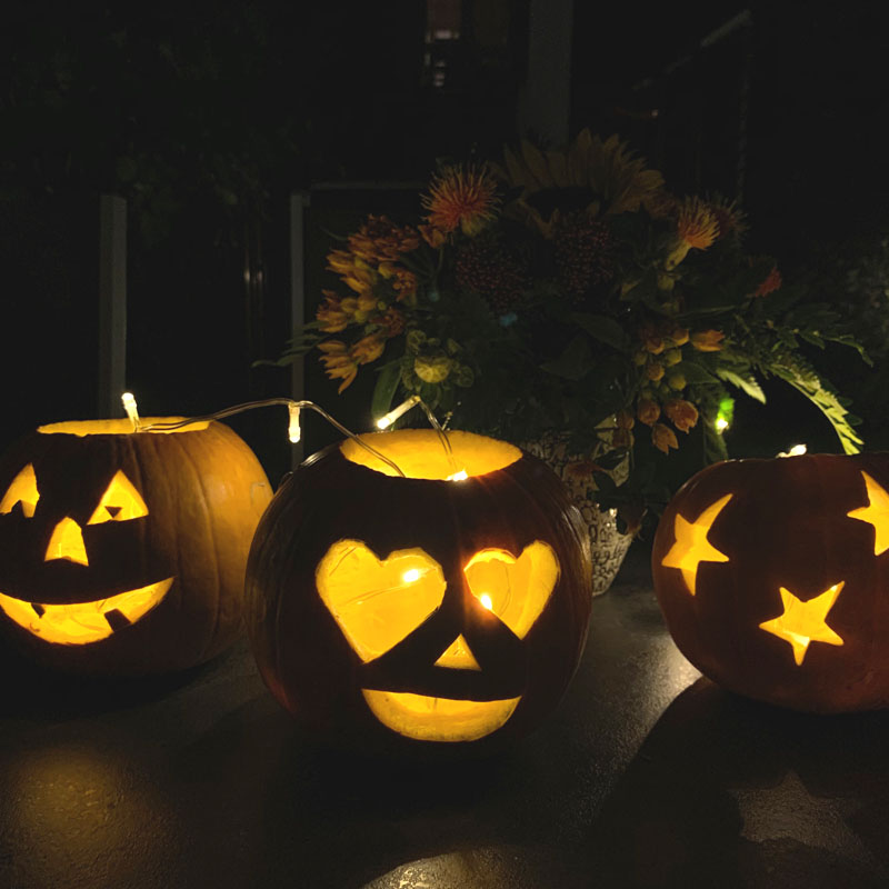 Der November beginnt auf der Tanzfläche. Wir feiern Halloween. Als die Kinder am Tag zuvor diese Kürbisse schnitzen, serviere ich eine bunte Platte.
