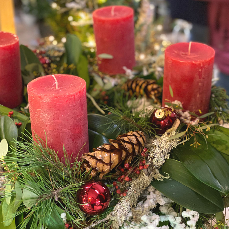 Fertig! Der Adventskranz 2019 steht auf der Terrasse und wartet auf seinen Einsatz. Er sieht aus, wie jedes Jahr und doch ganz anders. Rot und grün sind meine Farben. Ich kaufe immer einen grünen Kranz und peppe ihn mit Moos, Ästen und Deko auf.