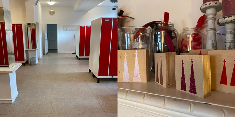 Das Tochterkind braucht neue Sportklamotten. Deswegen fahren wir zu Rot-Weiß, wo sie sich in der Umkleide der sonst eigentlich gegnerischen Mannschaft umziehen darf.