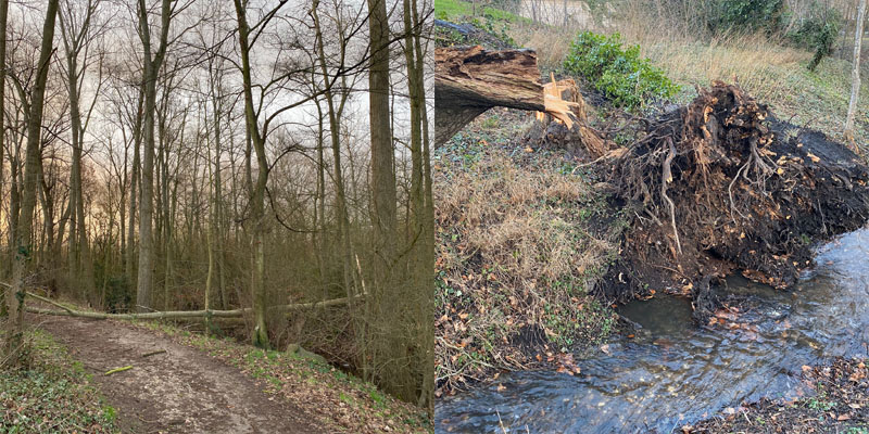 Sabine fegt über’s Land. Ich war ganz schön gespannt und auch etwas aufgeregt, habe mich im Vorfeld aber nicht verrückt gemacht. Trotzdem habe ich rumstehendes Zeug im Garten weggeräumt. Am nächsten Morgen drehe ich meine Runde mit Mollie – hier und da umgefallene Bäume.