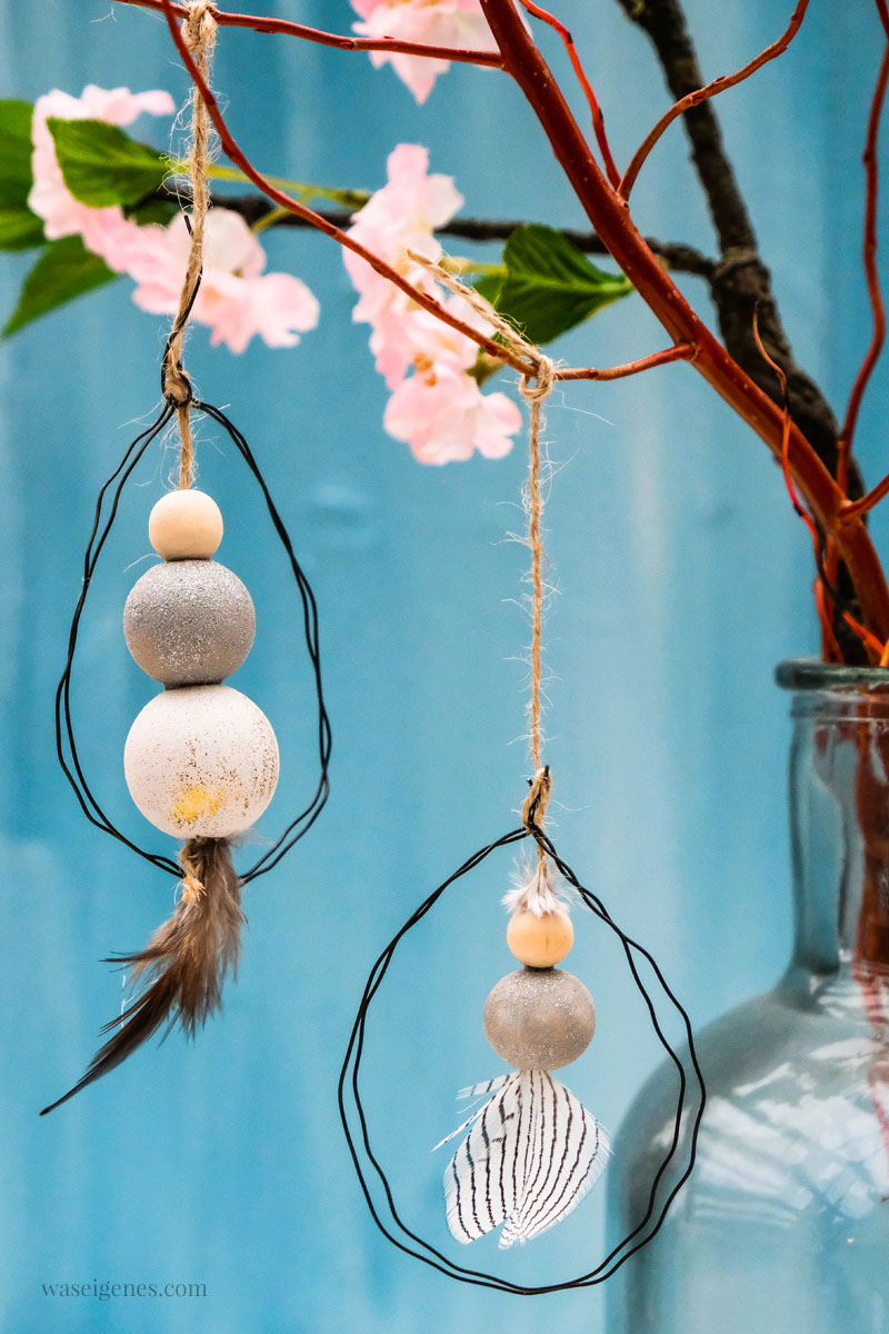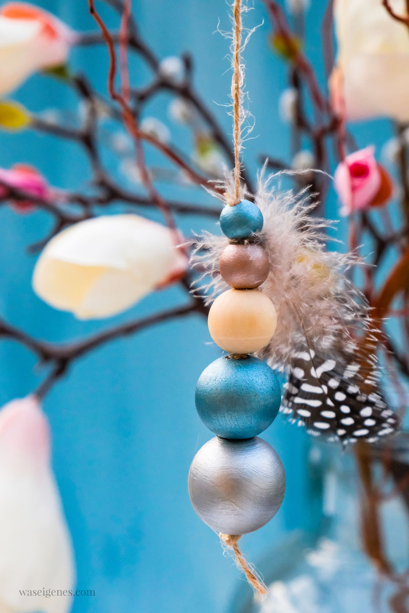 Bei einer Variante (Bild oben) habe ich die bemalten Kugeln auf eine Kordel gezogen, an der untersten Kugel einen Knoten gemacht und oben genügend Kordel übrig gelassen, damit ich die Anhänger auch gut an die Äste des Osterstrauchs hängen kann. Sollte die Öffnung der untersten Kugel zu groß sein und der Knoten durchrutschen, dann könnt Ihr die Kordel mit einem Klecks Heißkleber fixieren. Und wer mag, steckt vorher noch eine Feder hinein oder dazwischen. Diese werden ebenfalls mit Heißkleber fixiert.