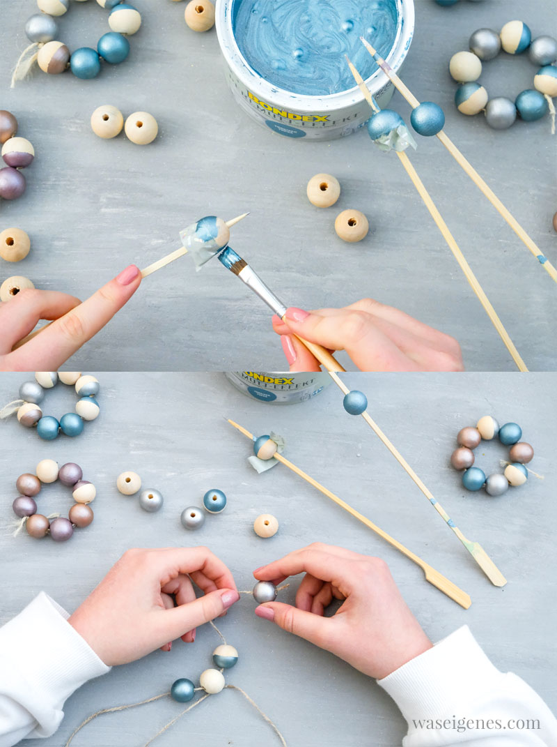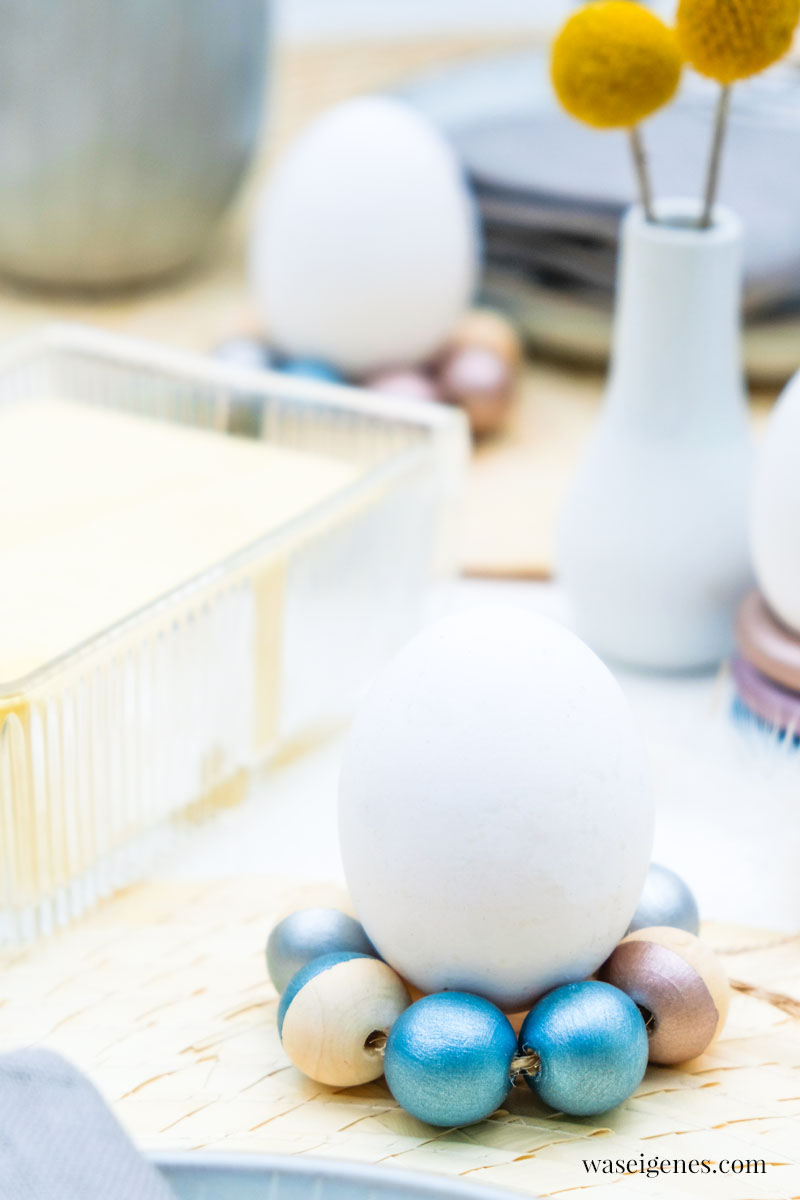 Diese Eierbecher sind so schnell gebastelt, da sind die Eier noch gar nicht fertig gekocht. Die acht Holzkugeln habe ich in unterschiedlichen Farbtönen angemalt, mal komplett, mal nur zu Hälfte und sie dann auf eine Schnur aufgezogen.