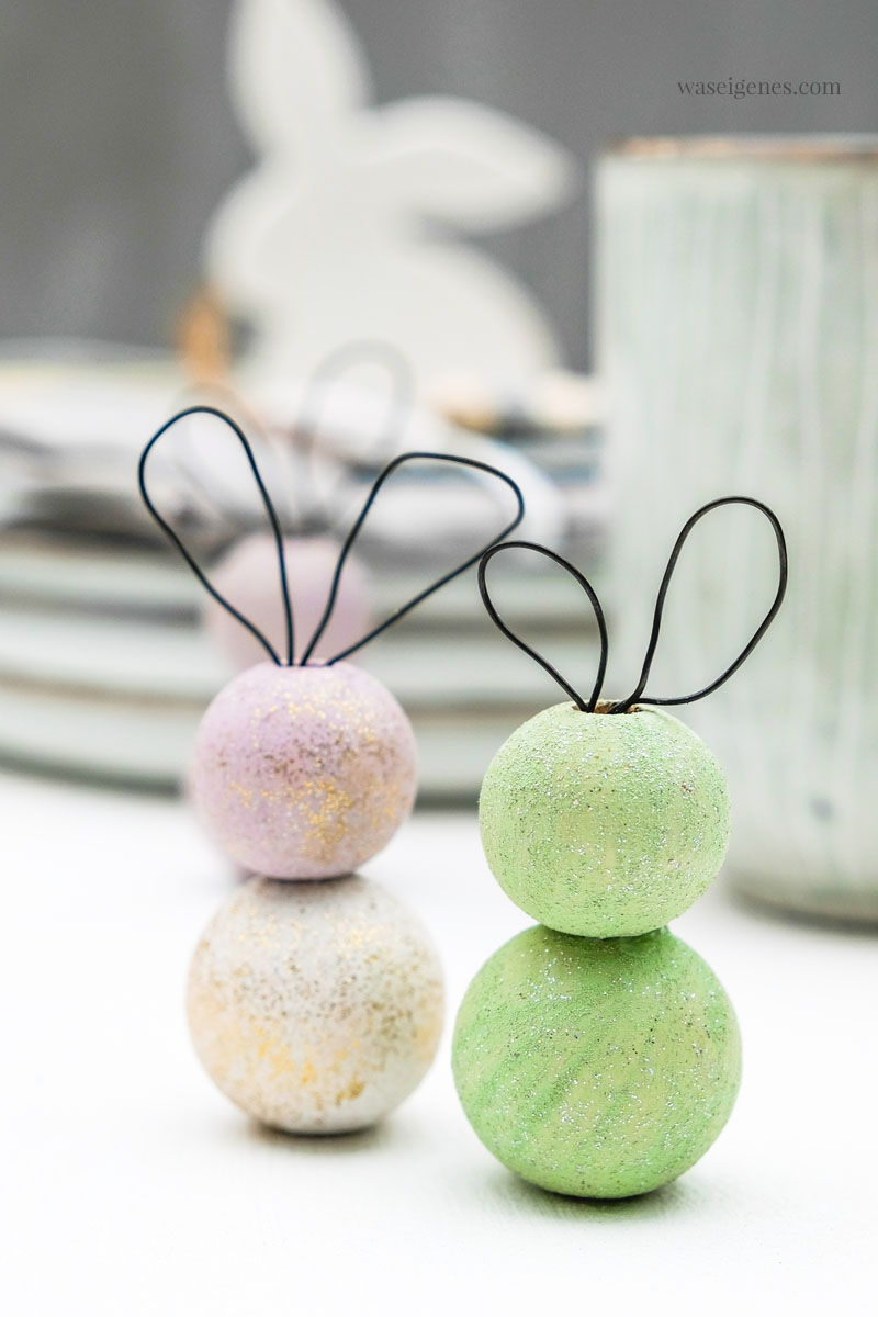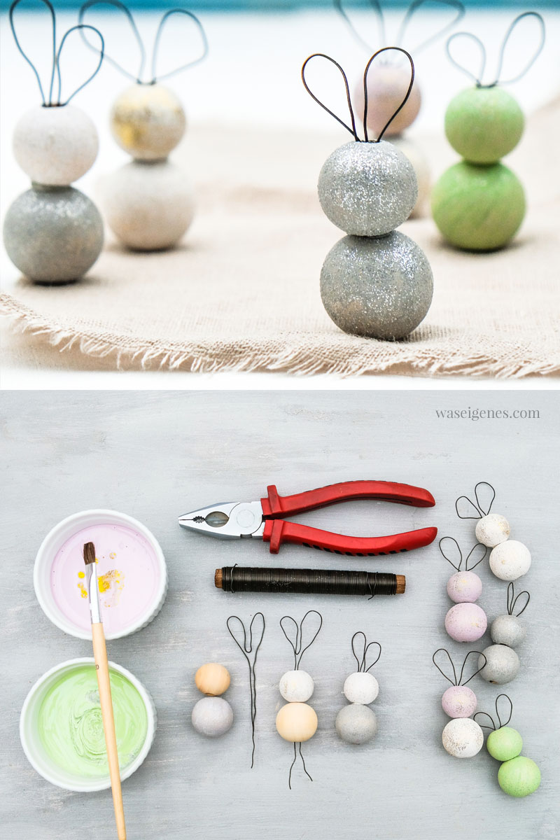 Für die Osterhasen benötigt Ihr nur jeweils zwei unterschiedlich große Holzkugeln und Basteldraht. Die Kugeln werden wieder in der gewünschten Farbe bemalt – ich habe mich hier für die Glitzer-Variante entschieden.