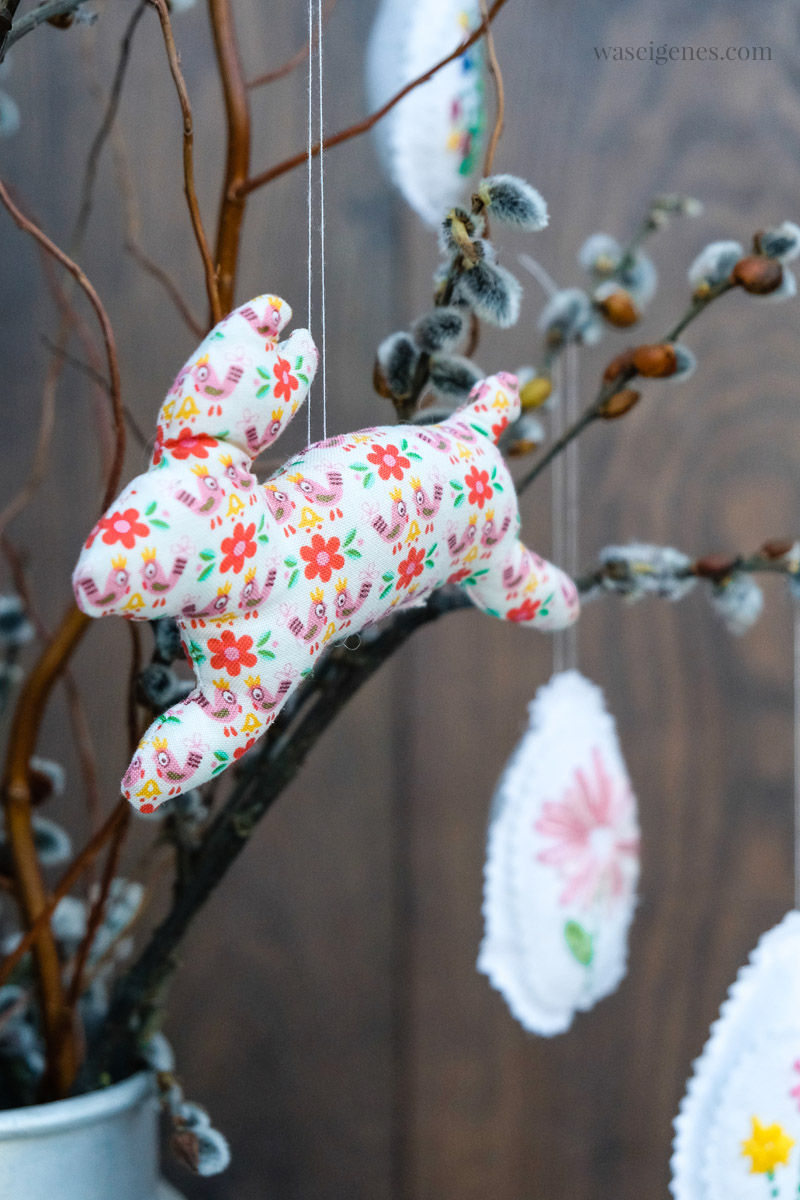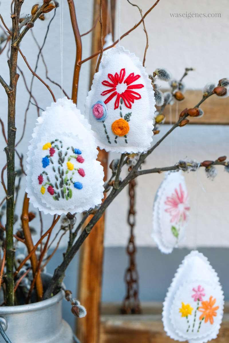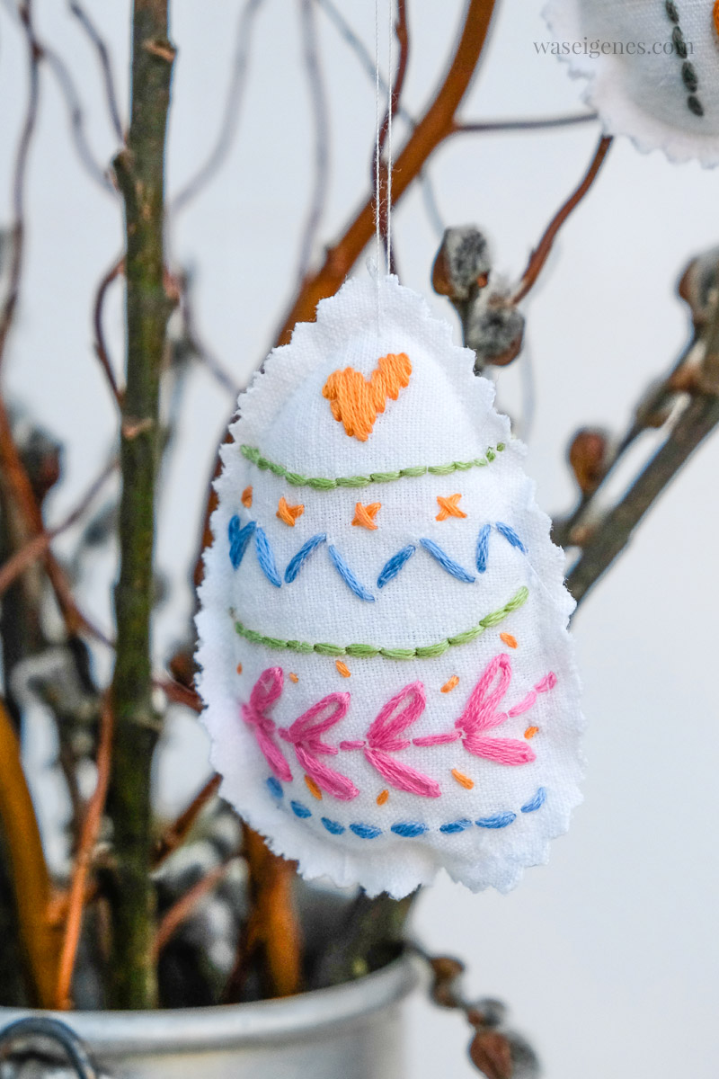 Das Besticken der Ostereier habe ich gleich nach meinem floralem Stickbild angefangen. Ich habe ein weißes Stück Stoff in einen Stickrahmen eingespannt und frei nach Schnauze kleine Blumen gestickt. Dann habe ich drumerum ein Ei mit der Zackenschere ausgeschnitten, ein zweites Stück Stoff für die Rückseite und beide Eierseiten mit der Nähmaschine zusammen genäht. Kurz vor Schluss noch etwas Füllwatte reingestopft, fertig.