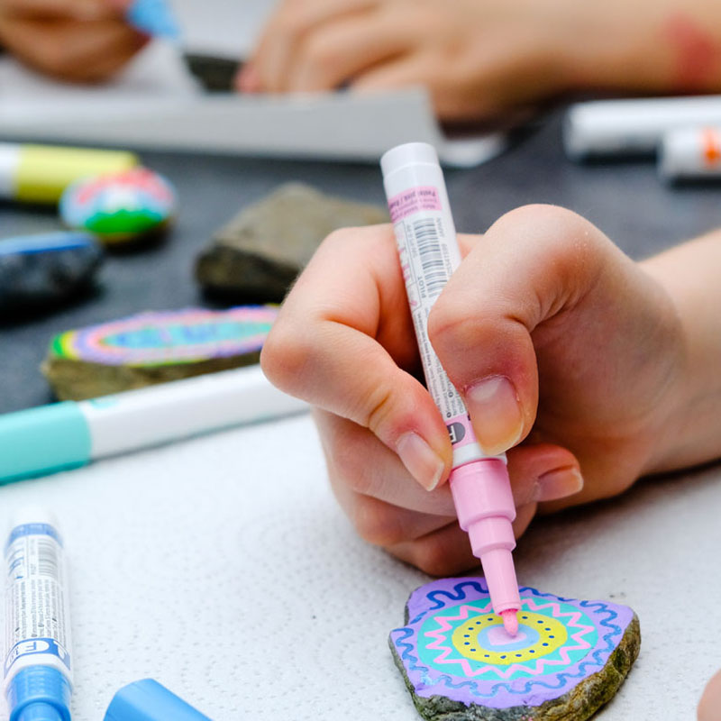 Im Mai sitzen wir oft auf der Terrasse und bemalen Steine. Die nehmen wir dann zu unseren Spaziergängen mit und verstecken sie im Wald.