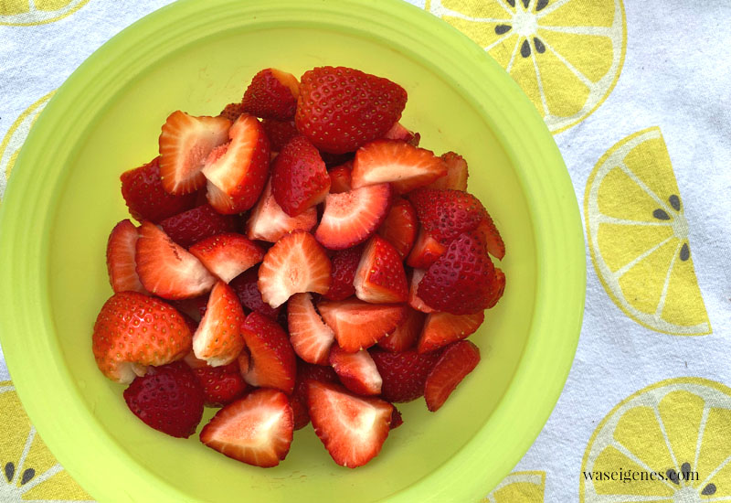 Schnell Lebensmittel für`s Wochenende einkaufen. Ganz wichtig: eszet Schnitten und Erdbeeren.