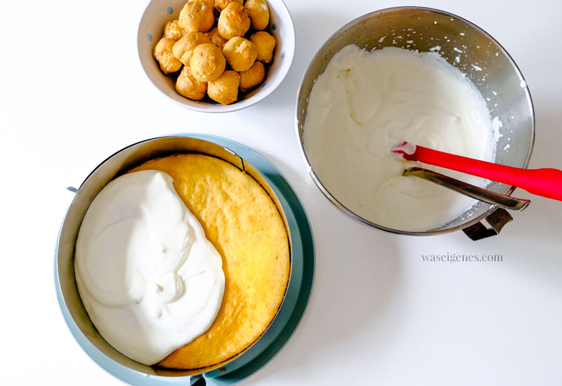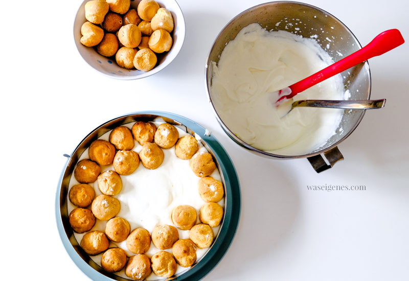 - Dann den restlichen Teil der Creme auf den Windbeutel verteilen. Es bleiben einige wenige Windbeutel übrig. Es sei denn, Ihr nutzt eine etwas größere Springform.