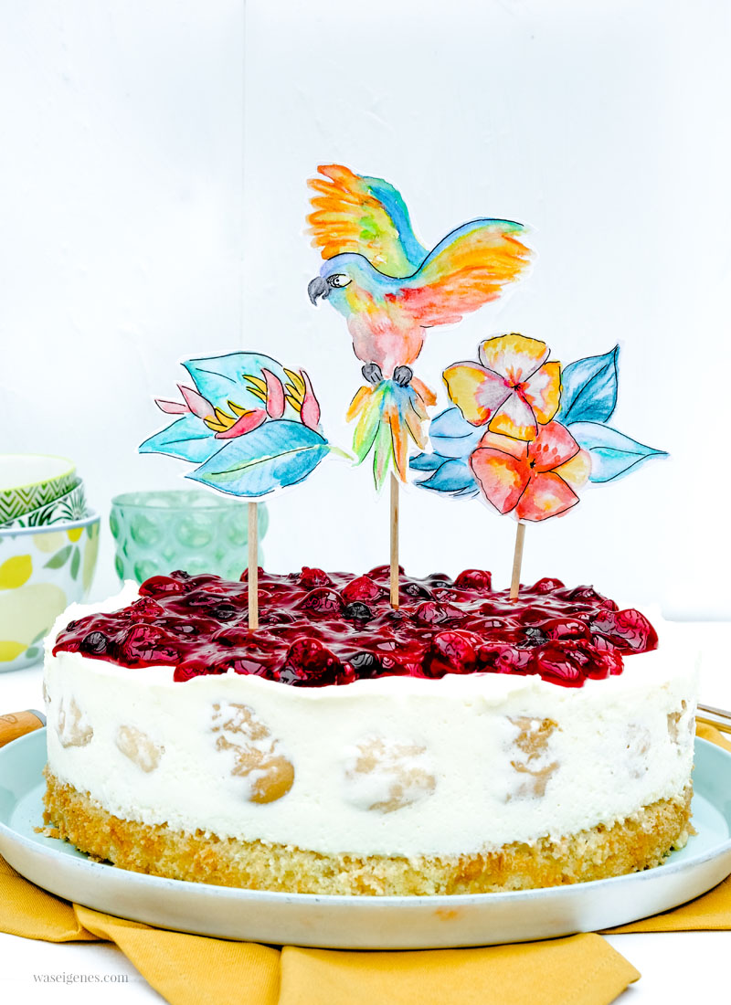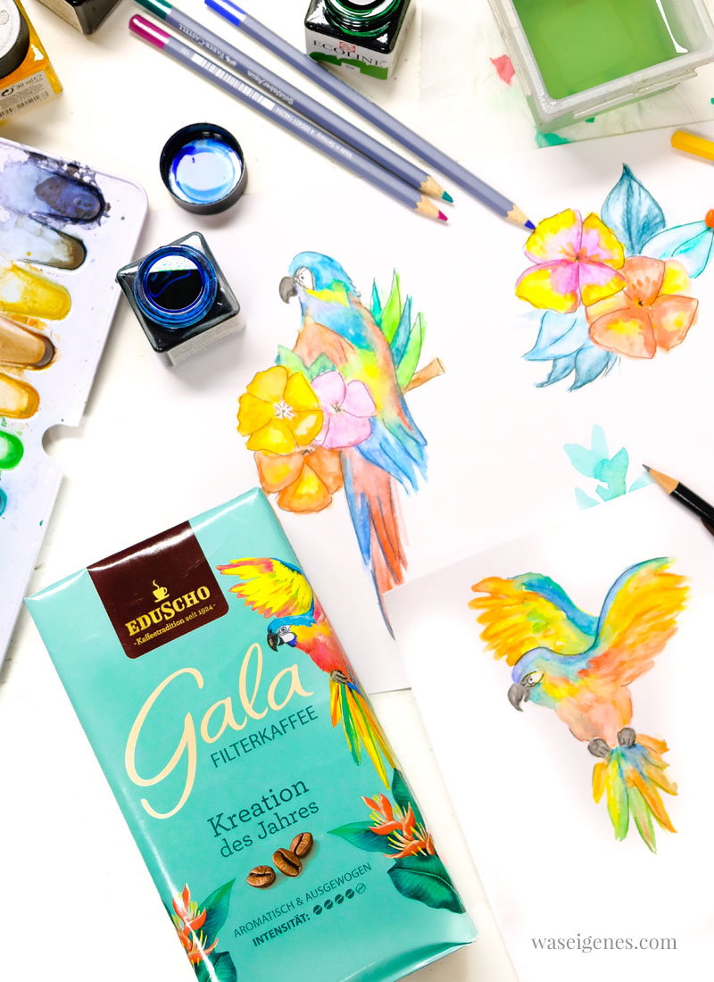 In diesem Jahr ziert die Gala von Eduscho „Kreation des Jahres” einen bunten Papagei. Die Verpackung ist nicht typisch kaffeebraun oder cremefarben, sondern sommerlich türkis. Sie hat mich dazu inspiriert, für meine Windbeutel Torte sommerlich-tropische Cake Topper zu malen und zu basteln.