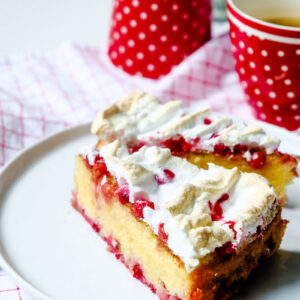Johannisbeerkuchen mit Baiserhaube und Buttermilch