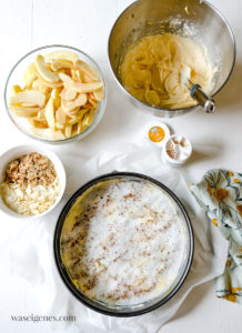 Achtet darauf, dass Ihr zu den Äpfeln nicht all zu viel Zitronensaft gebt – ich war da etwas maßlos. Deswegen hatte der Kuchen einen Hauch von Zitrone, was ich ja gar nicht beabsichtigt hatte.