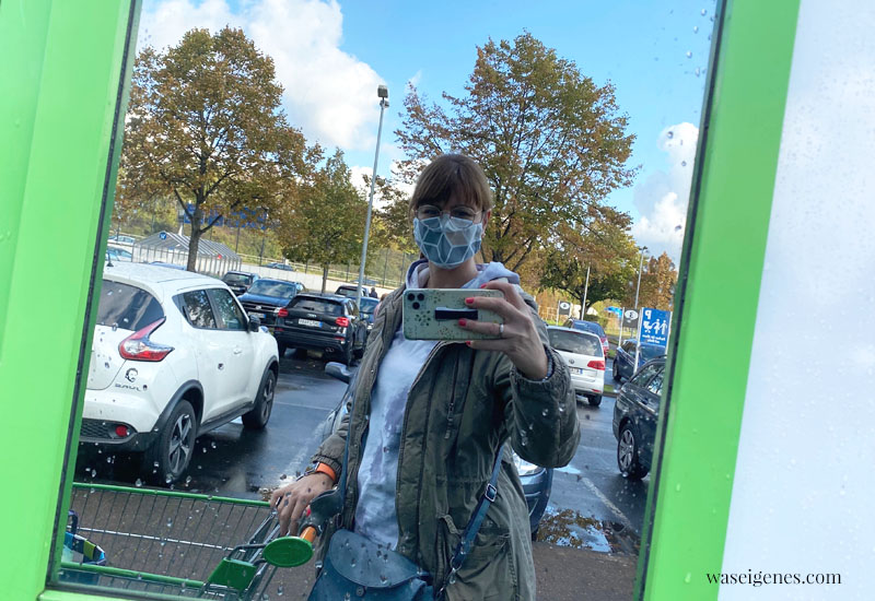 Spiegel-Selfie mit Maske. Köln ist jetzt Risikogebiet. Der Rhein-Erft-Kreis noch nicht, aber das kann ja nicht mehr lange dauern. 48,6! :-( Schnell nach Hause.