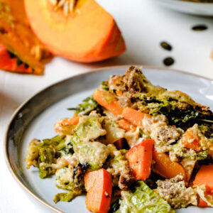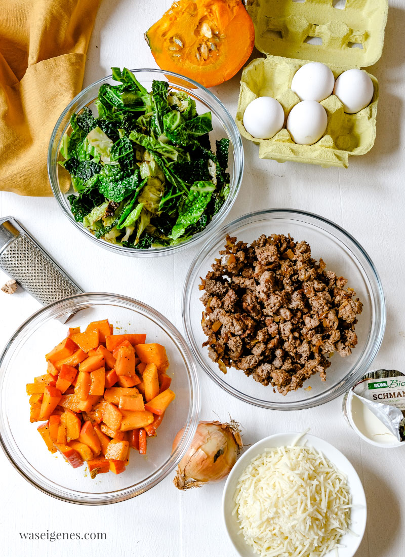 Ich präsentiere heute einen herzhaften, warmen Auflauf mit Lieblings-Lebensmittel. Kürbis, Wirsing, Muskatnuss, Hack und Käse.
