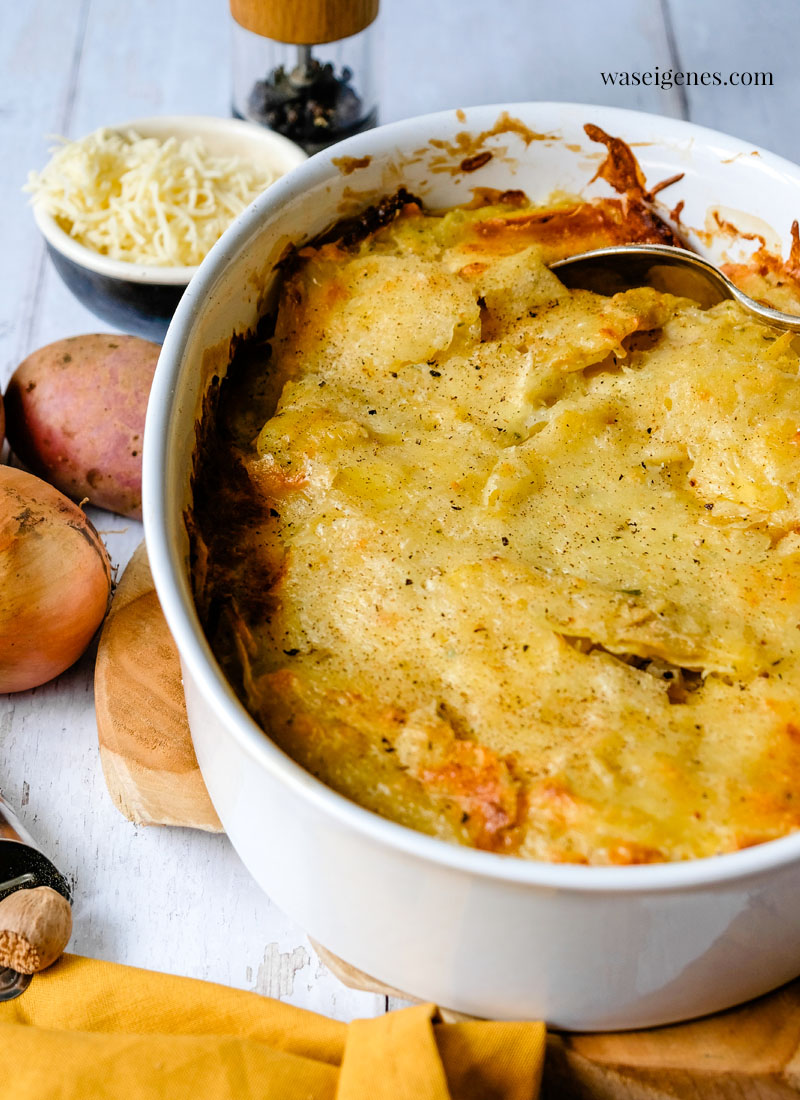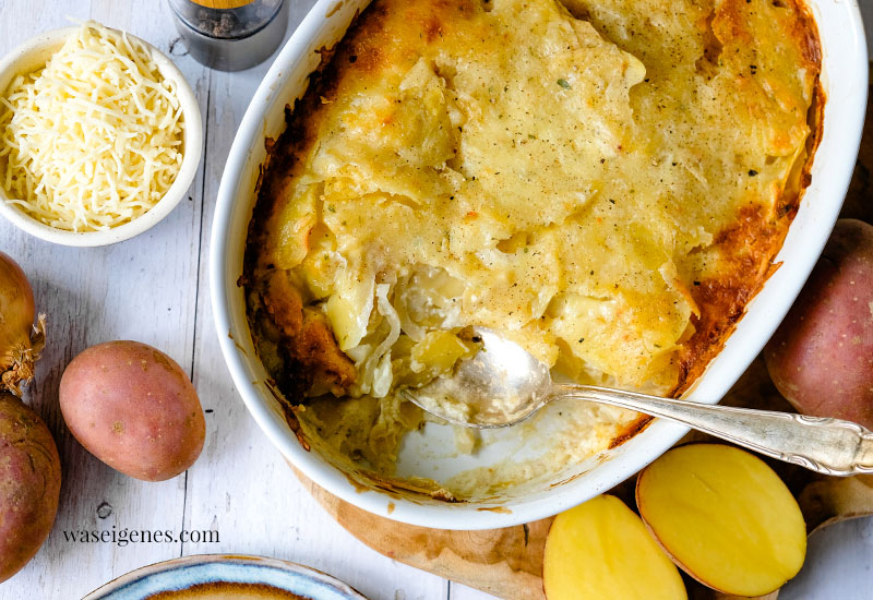 Und da wären wir schon beim nächsten Pluspunkt dieses Gerichtes: Es ist ein Ofengericht. Während der Ofen die Kartoffeln gar und weich backt und den Käse zu einer knusprigen Kruste brutzelt, ist genügend Zeit die Küche aufzuräumen, durch Instagram zu scrollen oder besser den Tisch zu decken. Oder noch besser, die Kinder zu rufen, sie sollen den Tisch decken.