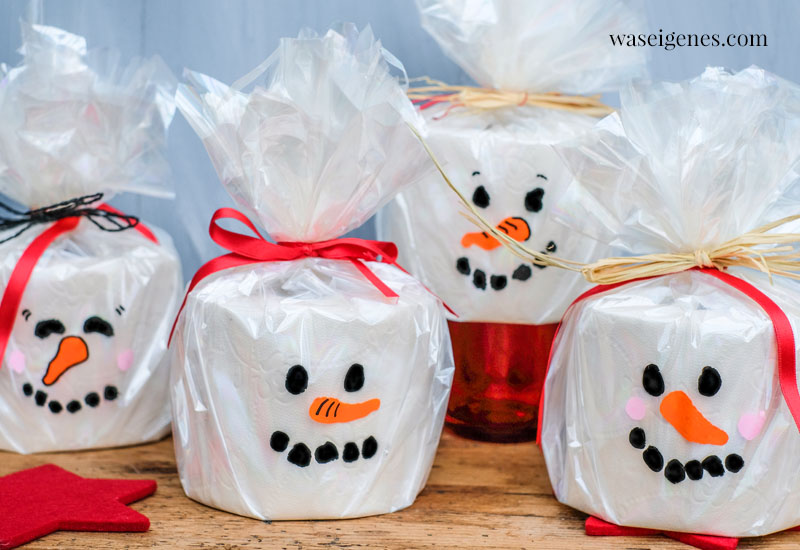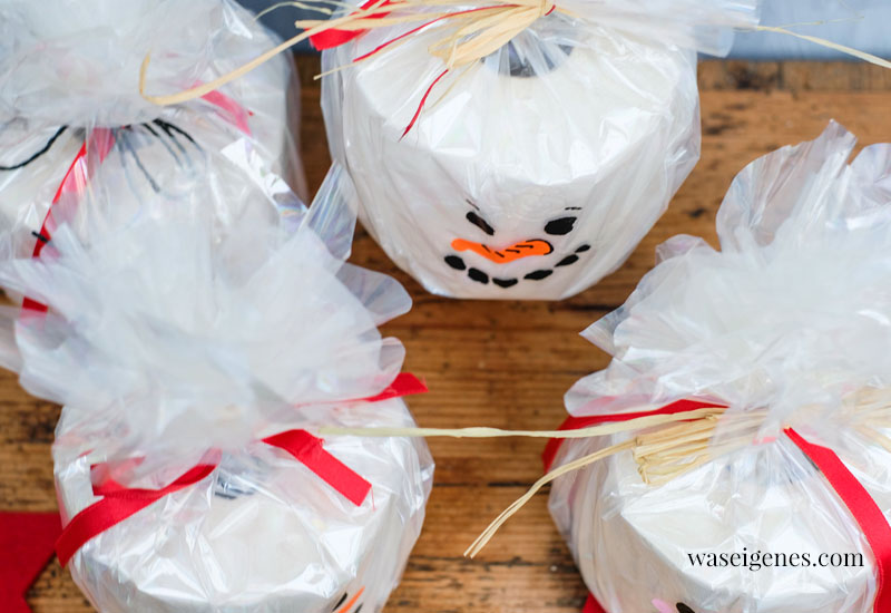 Und wenn Ihr das noch in Folie {I know – das Thema Umwelt muss an dieser Stelle mal kurz vergessen werden} verpackt und ein Schneemann-Gesicht darauf malt, dann flippen die Beschenkten aus.