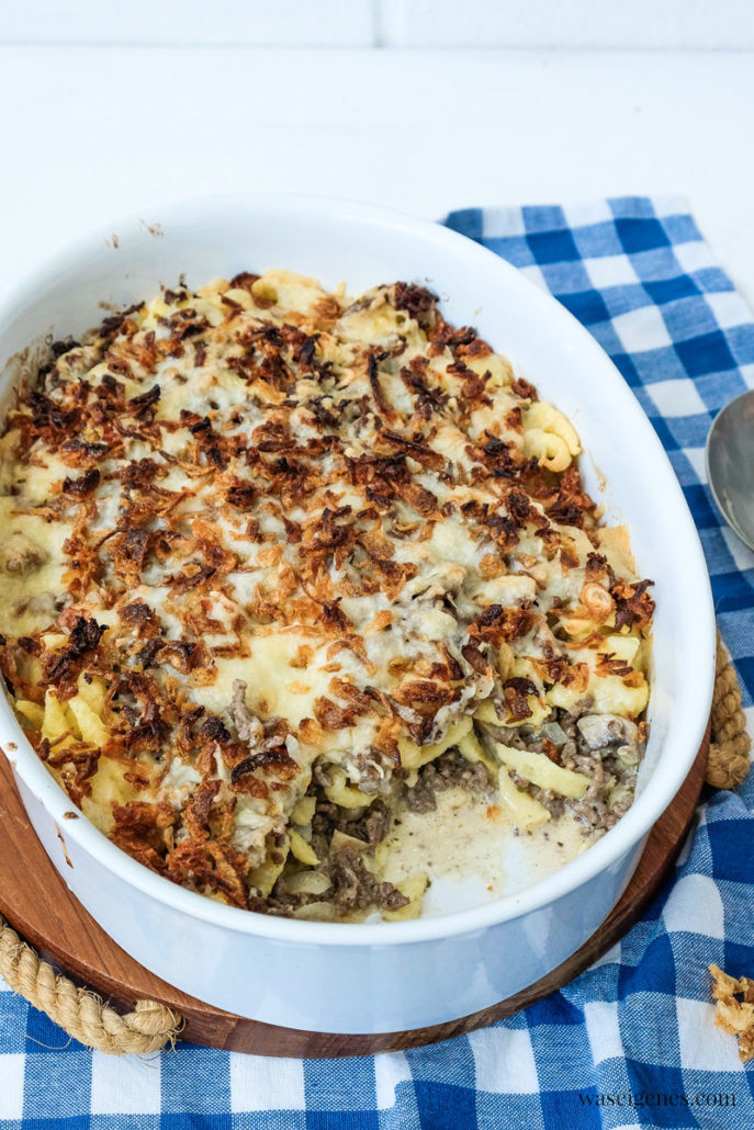 6.) Der Spätzleauflauf mit Hack, Champignons und Röstzwiebeln.
