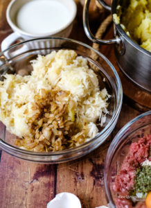 - Dann die Hälfte davon zusammen mit dem Sauerkraut in einen Topf geben und mit etwas Wasser dünsten. Mit Salz & Pfeffer würzen.