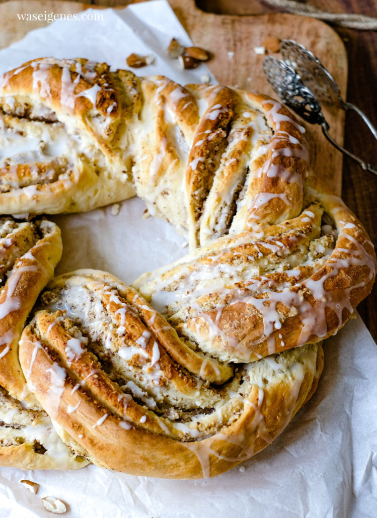 Hefekränze backe ich allein deswegen schon gerne, weil sie immer so hübsch aussehen. Diesmal habe ich meinen Kranz mit einer leckeren Masse aus gehackten Nüssen, Mandeln, Sahne und Puderzucker gefüllt.