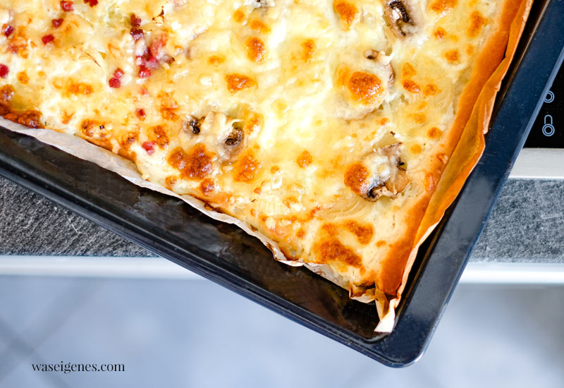 Fast schon Mittagszeit, also schnell in die Küche. Heute gibt es Flammkuchen à la Hoppenstedt, der eigentlich kein richtiger Flammkuchen ist, sondern eine Art Zwiebel-Speck-Pizza auf der einen und Champignon-Mozarella-Pizza auf der anderen Seite ist.