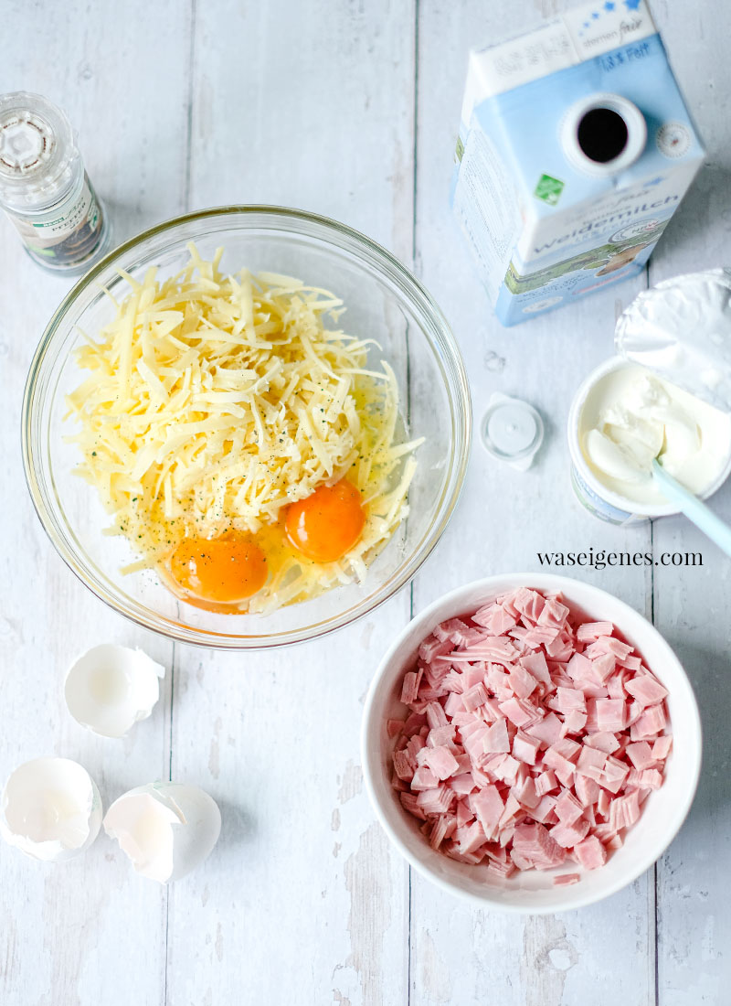 In meinen Nudel-Schinken-Auflauf kommen nur Nudeln, gekochter Schinken, eine Eier-Schmand-Milch und würziger Bergkäse. Nicht zu vergessen: Eine ordentliche Portion Muskat. Muskatnuss gehört für mich in ganz viele herzhafte Gerichte.