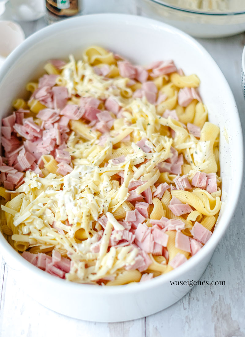 - Die gekochten Nudeln abgießen und mit dem Schinken in einer Auflaufform schichtenm bzw. mischen.