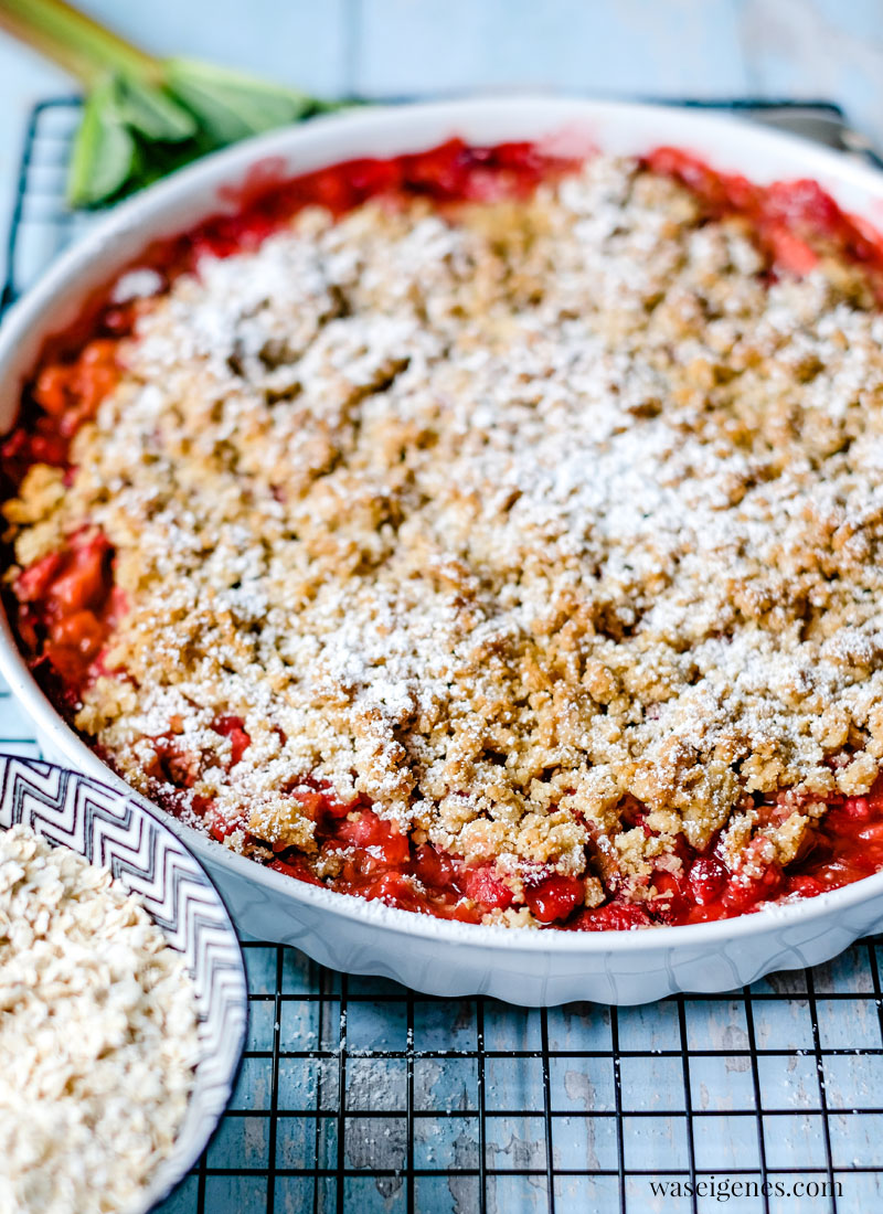 Diesen Crumble hier solltet Ihr jedenfalls probieren. Er ist ein fruchtig-frisches Frühlingsdessert, ist in null Komma nichts zu bereitet und in 25 Minuten im Ofen gebacken, läßt sich wunderbar vorbereiten und später nochmal aufwärmen und schmeckt einfach fantastisch sauer-süß.