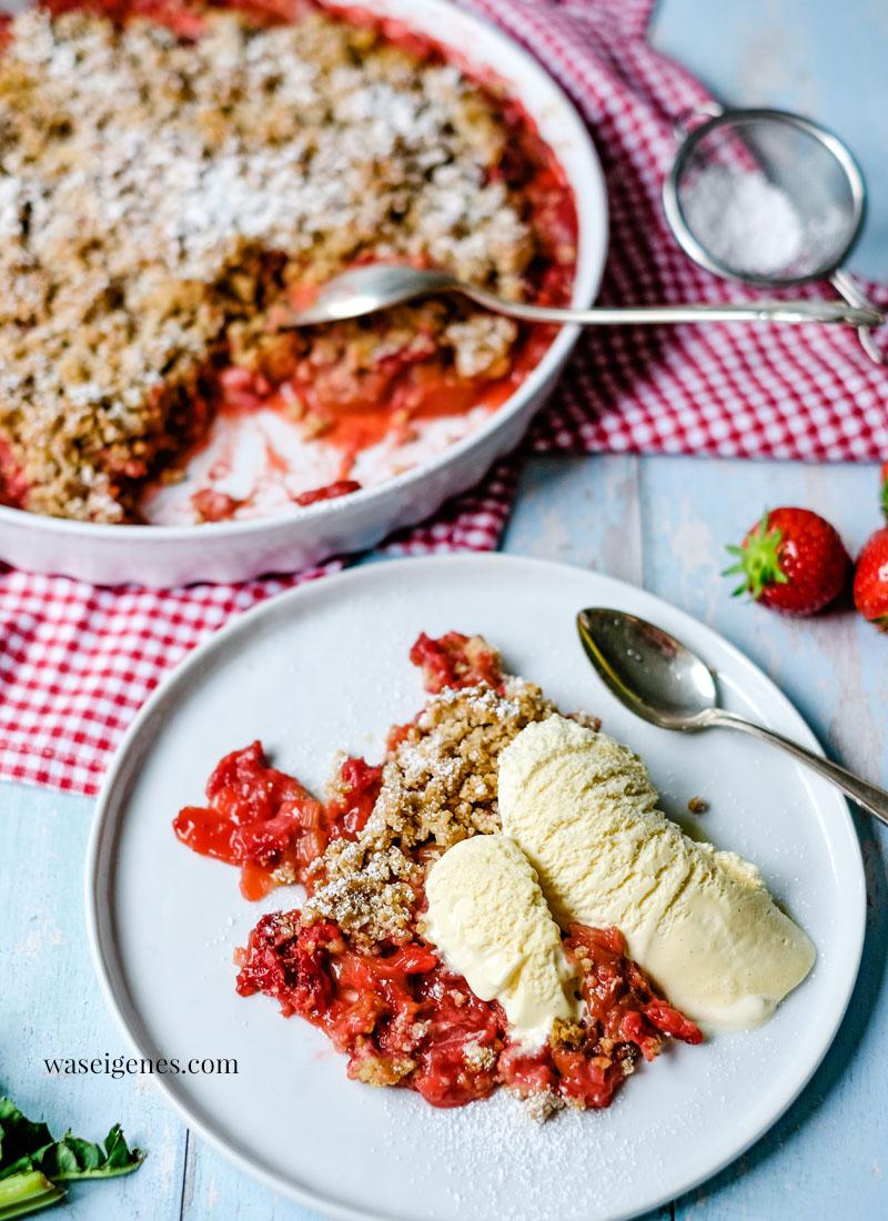Die Rhabarber-Saison habe ich hier in den letzten Wochen vollumfänglich durchexerziert. Es wird Zeit, dass mehr Erdbeeren ins Spiel kommen. ;-) Den Anfang machte ja letzten Samstag bereits der Erdbeerkuchen mit Biskuitboden und Vanillepudding. Bei diesem heutigen Rezept hier, habe ich Erdbeeren und Rhabarber kombiniert und einen köstlichen, süß-sauren Erdbeer-Rhabarber-Crumble mit Haferflocken-Streusel gemacht und gebacken.