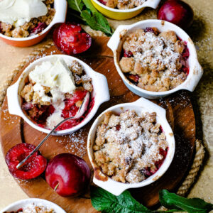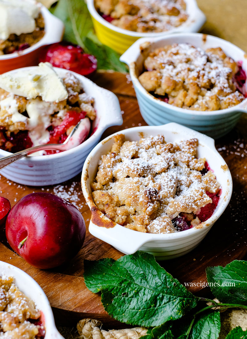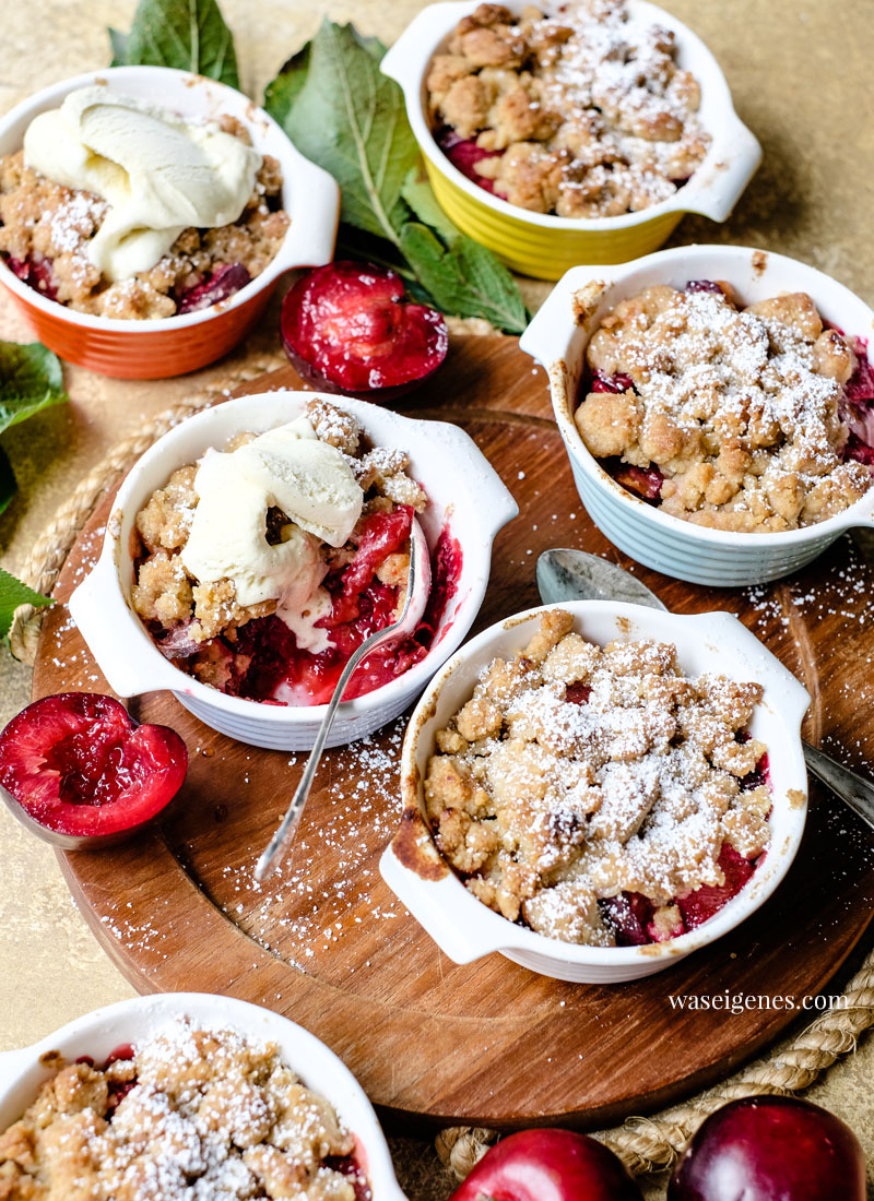 Was ich an diesem Crumble besonders liebe: Ihr könnt ihn in einer großen Form backen oder – wie ich – in kleine Förmchen. Das sieht nicht nur hübsch aus, dass ist auch eine schöne Dareichungsform für Eure Gäste. So ein Crumble mit Pflaumen ist für mich der Inbegriff von Gemütlichkeit, Genuss und Spätsommer.