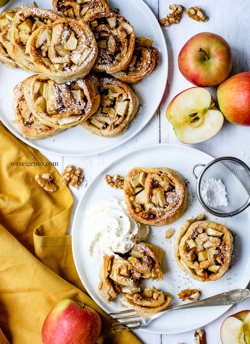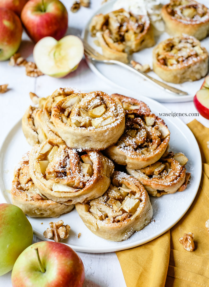 Wie wäre es denn heute mit leckeren Apfel-Joghurt-Schnecken? Also ich würde da nicht nein sagen. Als ich diese Schnecken letzte Woche gebacken und dann meiner Familie vorgesetzt habe, waren sie erstmal skeptisch. Sie dachten nämlich, dass ich Hefeschnecken gebacken habe und erwarteten fluffigere Teilchen. Sorry, nein, diese Schnecken hier sind eher knusprig, apfelig, nussig, aber auch saftig. Alle drei probierten und bescheinigten mir: Lecker.