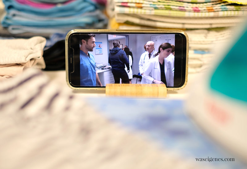 Und weil ich so im Flow bin, bügel ich noch fix einen Korb Wäsche weg. Das geht mir schnell von der Hand, denn ich schaue dabei “New Amsterdam” auf meinem Handy. Gefällt mir gut, diese Serie. Den Hauptdarsteller sehe ich dann abends manchmal mit dem Mann bei “Blacklist”. Auch eine gute Serie.