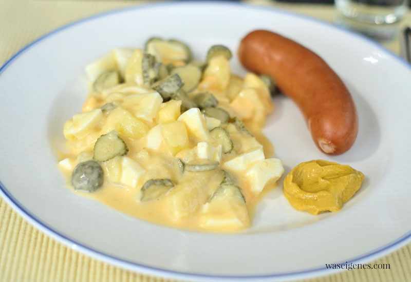 Als ich zurück komme, sitzt die Familie schon auf der Terrasse, der Tisch ist gedeckt, es gibt Kartoffelsalat und Würstchen und natürlich Senf. So lecker!