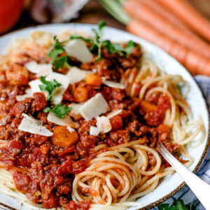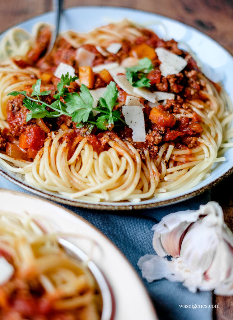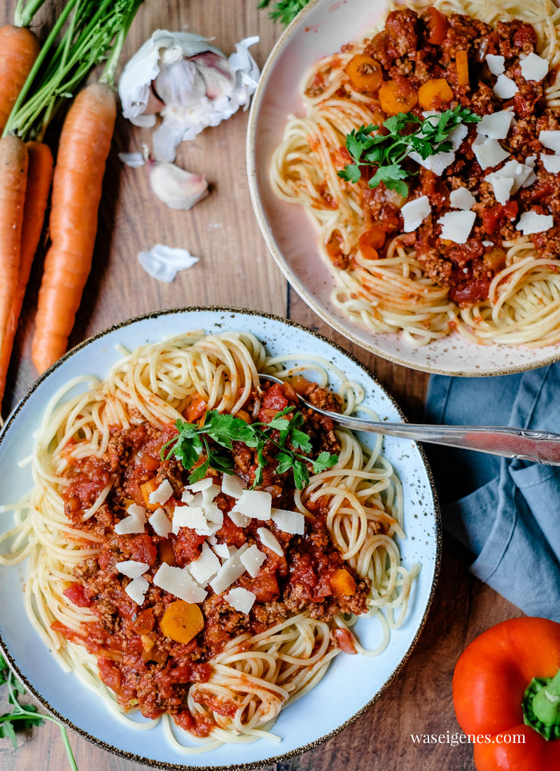Ich finde ja, dass gerade die Möhrchen, die Paprika und Tomatenstücke diese Hackfleischsoße so wunderbar fruchtig und einfach lecker machen. Was nicht fehlen darf, ist gehobelter oder geriebener Parmesan und natürlich eine groooße Portion Spaghetti.