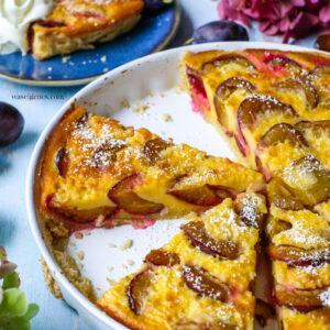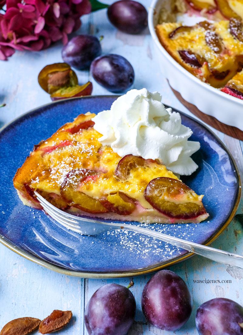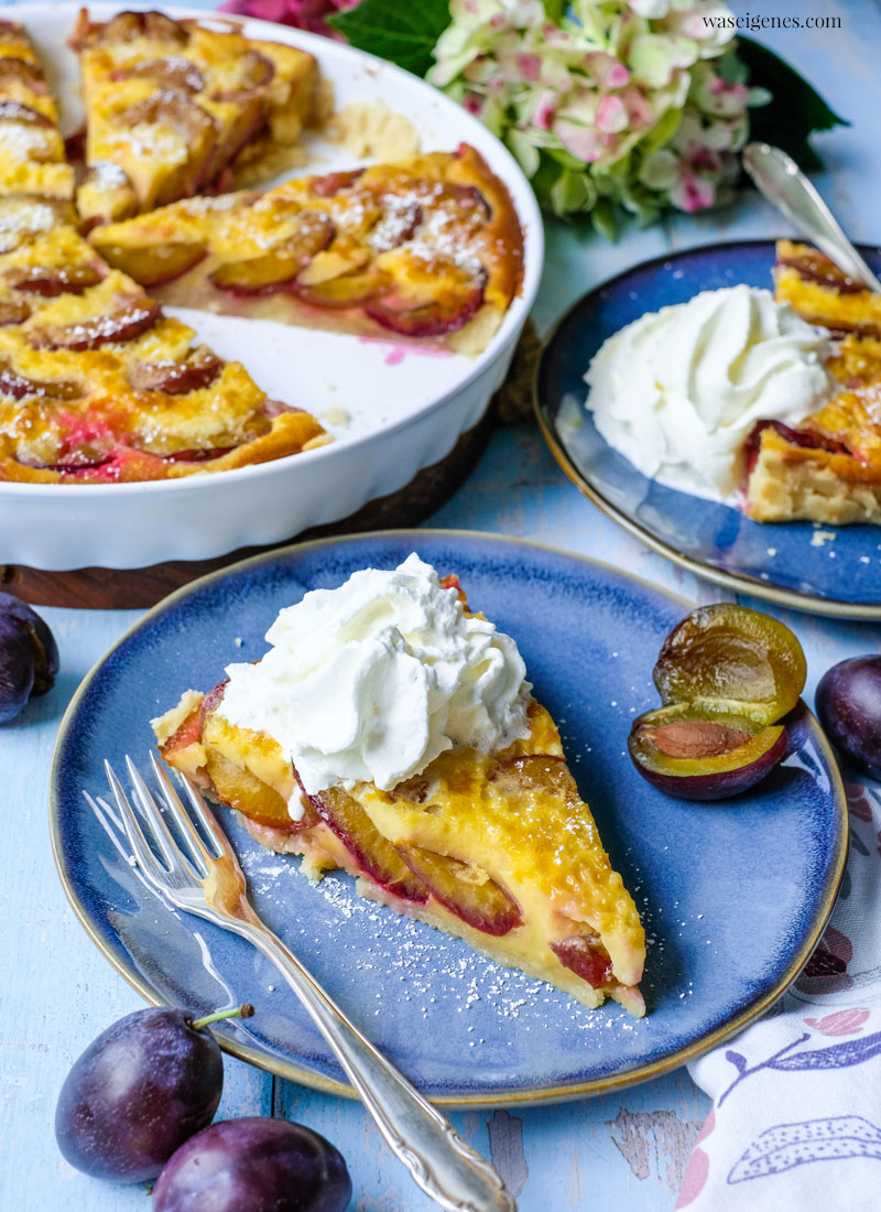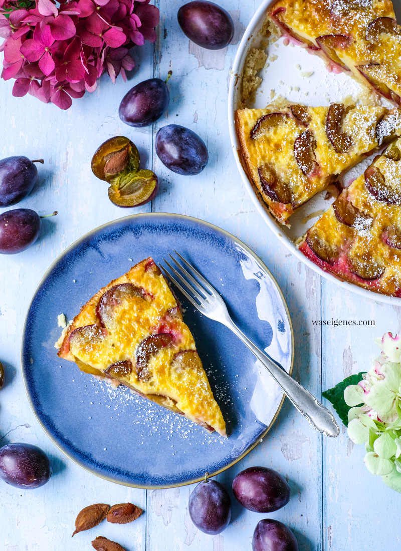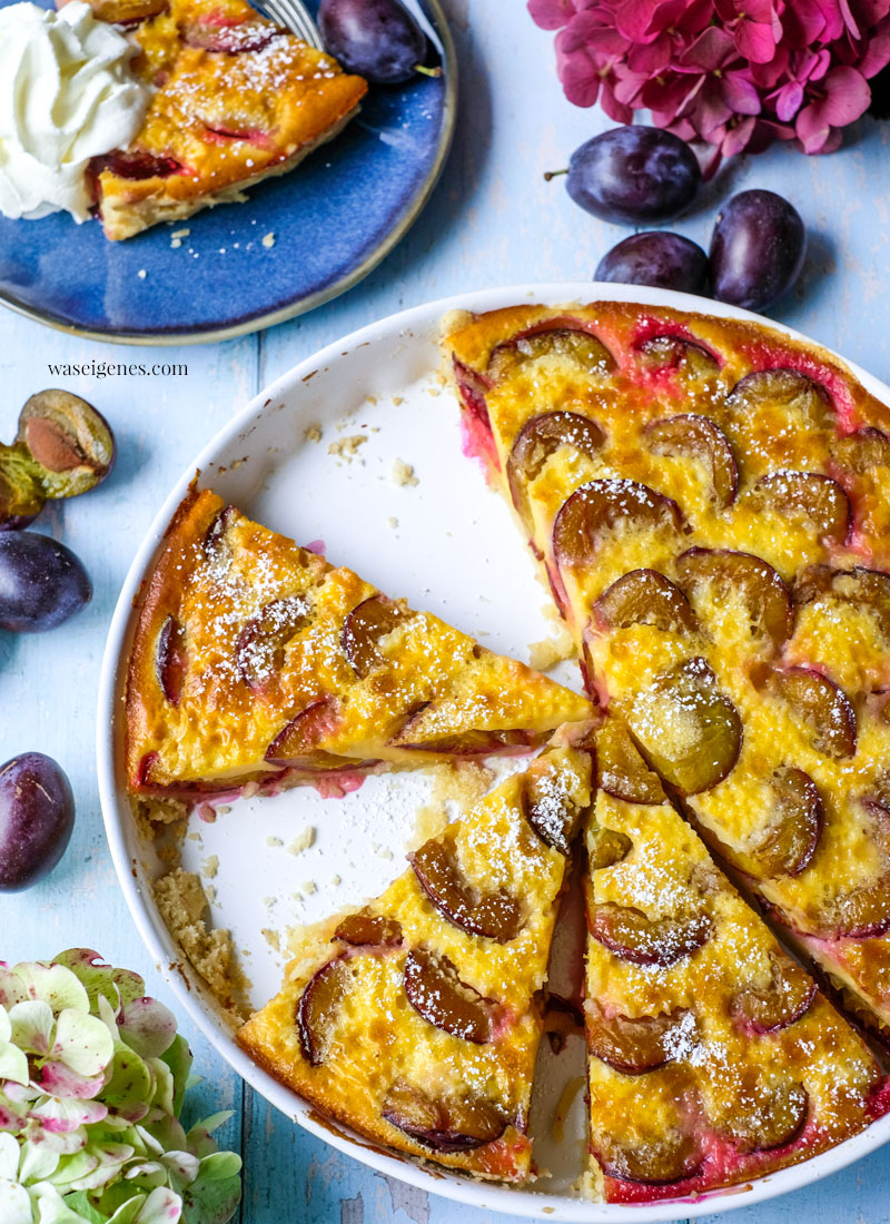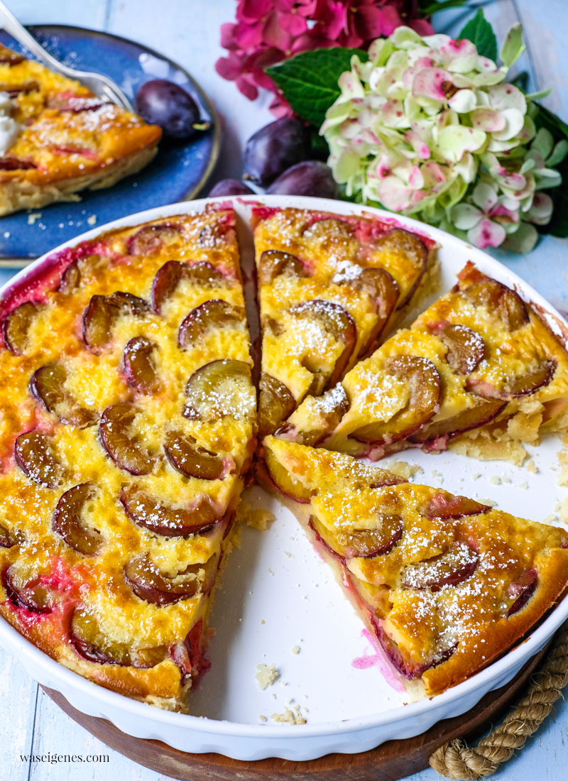 Zuletzt hatte ich Euch ja den Mund mit dem Pflaumen Crumble wässrig gemacht, heute gibt es eine Tarte. Die entkernten Pflaumen werden auf den vorgebackenen Teig in der Tartform gebettet und dann mit einem köstlichen Guss aus Schmand und Vanillepudding übergossen.