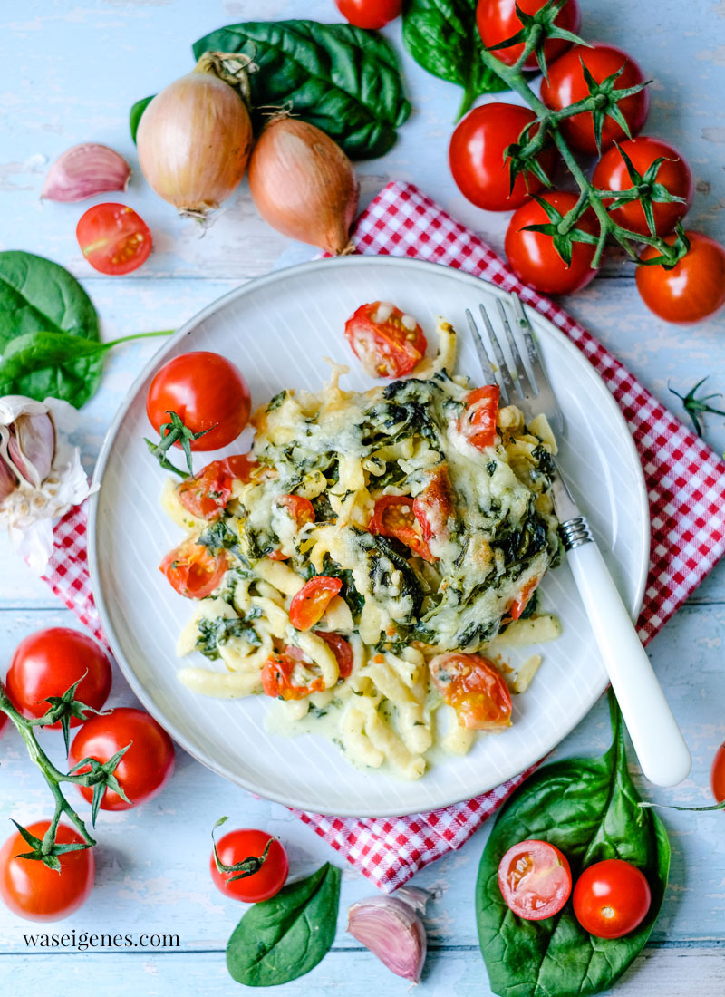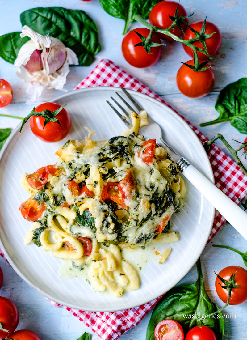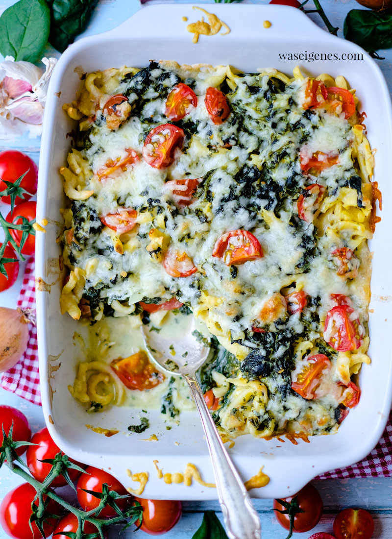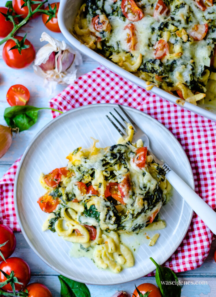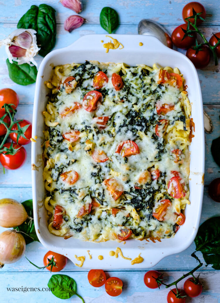 Blitzgericht: Spätzleauflauf mit Blattspinat & Tomaten.