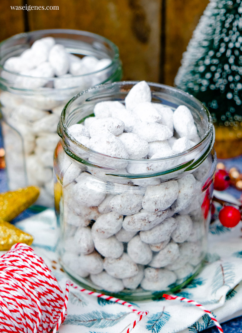 - Die gepuderten Mandeln aus der Schüssel in Gläser umfüllen.Solltet Ihr dabei zu viel übrig gebliebenen Puderzucker mit rausholen, fügt noch einen Zwischenschritt ein: die Mandeln in ein Sieb geben, erneut sachte schütteln, bis der überschüssige Puderzucker weg ist und dann umfüllen.