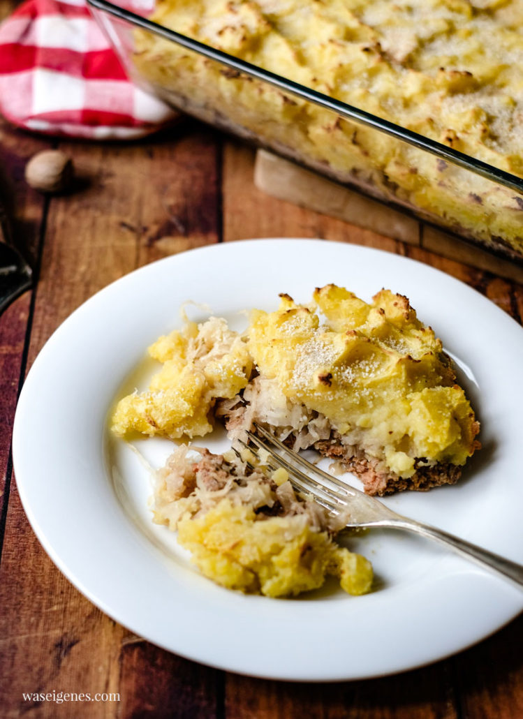 Im Ofen muss er nur 20 – 30 Minute backen, aber vorher muss man noch die Kartoffen kochen und stampfen und die Hack-Masse zubereiten. Danach werden Hack, Sauerkraut (ungekocht) und Kartoffelstampf in der Form geschichtet und gebacken. So lecker und ein tolles Gericht für kalte Tage.