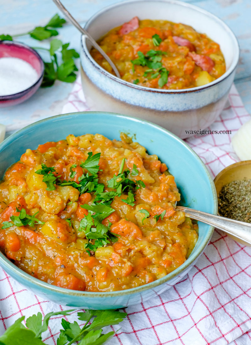 Besonders lecker schmeckt dieser sämige und dickflüssige Eintopf, wenn man gebratene Speckwürfelchen und Mettwürstchen mit reinpackt, aber Ihr wisst ja, und wenn nicht, dann wisst Ihr es jetzt, dass ich hier an einigen Tagen in der Woche auch vegetarisch kochen “muss” und deswegen gibt es dieses Gericht oft in zwei Varianten.