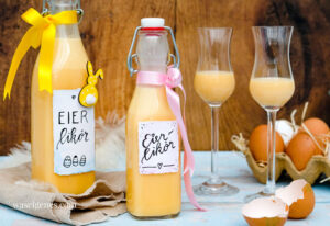 Ich erhalte immer mal wieder Fragen, wie lange sich denn selbst gemachte Liköre halten. Da kann ich nur sagen: Ich koche Likör, wenn ich ihn trinken oder verschenken möchte. Nicht, um ihn ewig im Schrank oder Kühlschrank aufzubewahren. Das Internet sagt, dass eine angebrochene Flasche Eierlikör im Kühlschrank bis zu 6 Monate hält. Bei der Zubereitung sollte man streng auf die Hygiene achten. Bitte nagelt mich auf diese Information aber nicht fest. Sollte er bei Euch nicht gleich “weg gehen”, dann probiert ihn, kostet ein mini Schlückchen und wenn Ihr dann meint, dass der Likör nicht mehr gut schmeckt, dann entsorgt ihn besser.