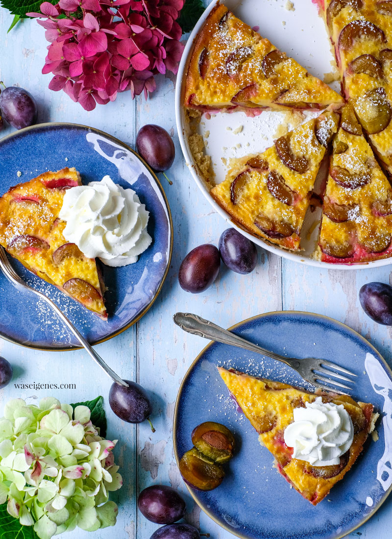 Die entkernten Pflaumen werden auf den vorgebackenen Teig in der Tartform gebettet und dann mit einem köstlichen Guss aus Schmand und Vanillepudding übergossen.