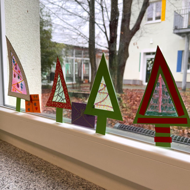 Im November klebten am Fenster in der Grundschule noch Fliegenpilze, nun kleben da hübsche kleine Weihnachtsbäume. Und die vier Kerzen an den Fenstern bekommen jede Woche eine Flamme dazu. So süß… da wo kleine Kinder sind, findet Weihnachten nochmal ein bisschen mehr statt.