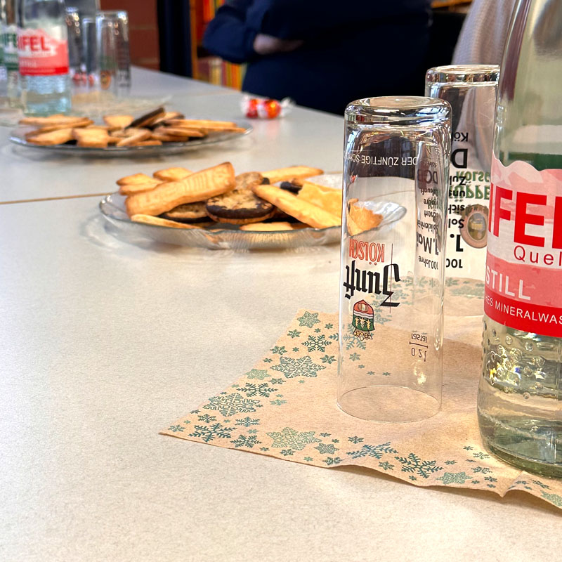 Das Treffen der Lesementoren in der Stadtbücherei ist sehr kurzweilig und nett und lustig. Hier trinkt man übrigens Wasser aus der Eifel aus dem Zunft-Kölsch-Glas. ;-)