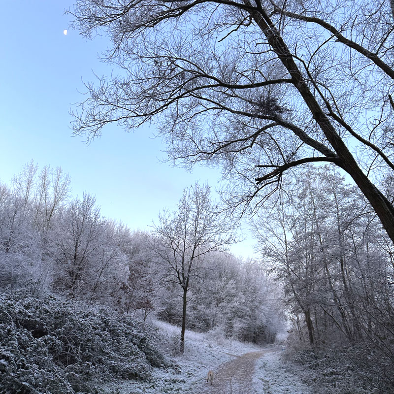 Und dann fallen die Temperaturen. Von Ende November, bis Mitte Dezember war es einfach viel zu warm. Nun (endlich) Minusgrade. Die Landschaft ist weiß gezuckert, ein traumhaftes Bild bei der morgendlichen Runde mit Mollie.