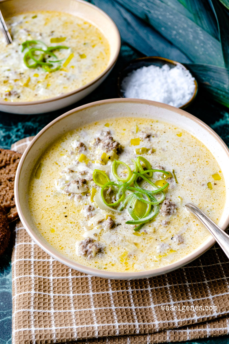 Sie ist einfach die perfekte Partysuppe, sie steht in knapp 35 Minuten auf dem Tisch, macht satt, läßt sich super bereits einen Tag vor der jeweiligen Feier oder dem Ereignis zubereiten und wenn etwas übrig bleibt, dann frieren wir sie einfach ein: Die Käse-Lauch-Suppe mit Hackfleisch.
