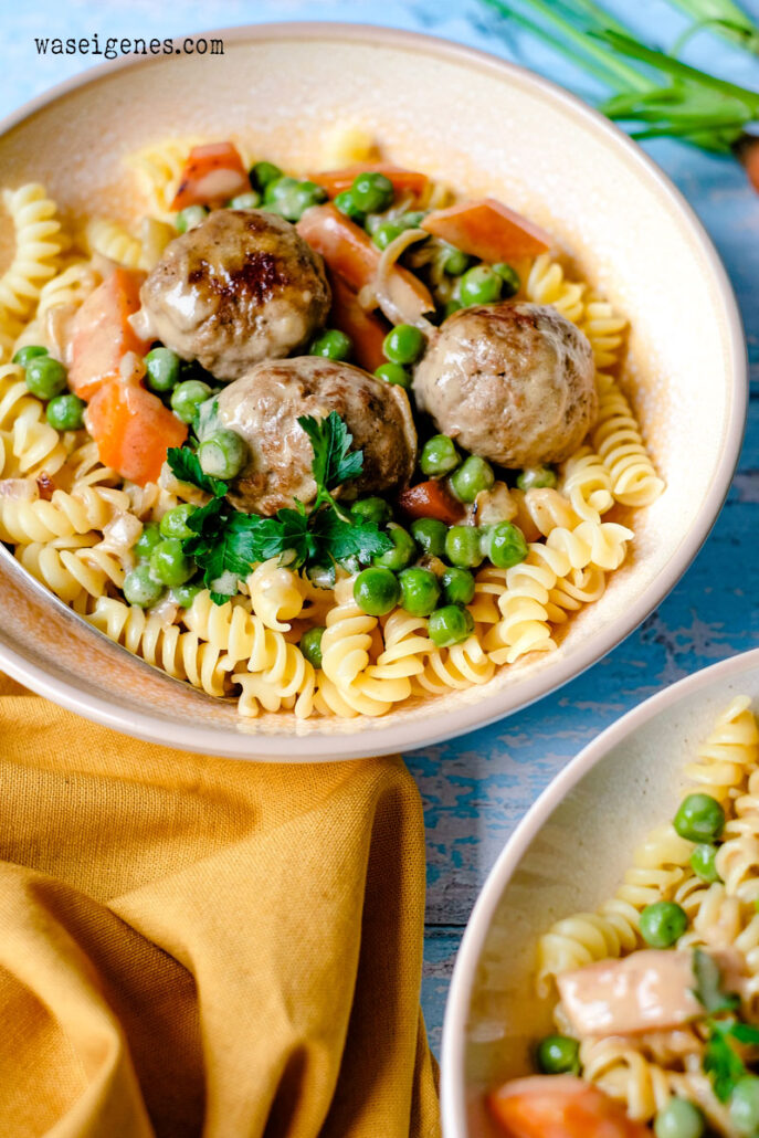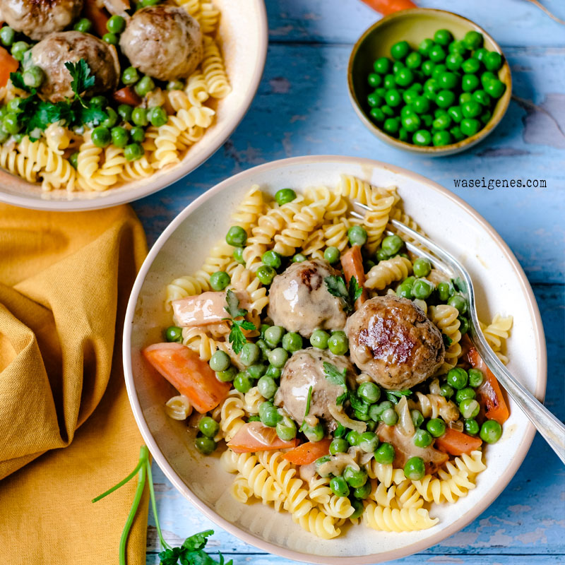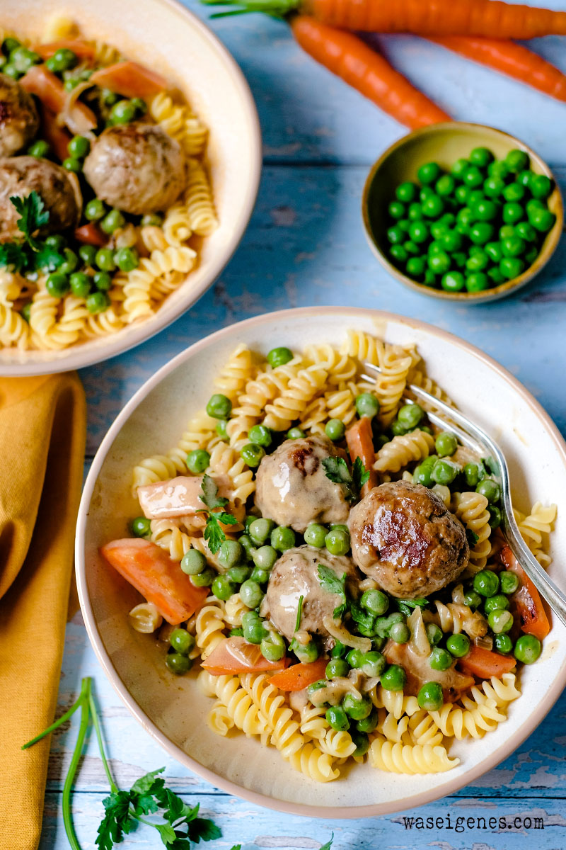 Diese cremige Hackbällchen Pfanne mit Erbsen und Möhren in heller Soße ist nicht nur tolles Ruck-Zuck-Gericht, sie ist auch ein Gaumenschmaus für Groß und Klein. Nudeln passen ganz wunderbar zu diesem herzhaftem Pfannengericht, aber auch Reis oder Kartoffelpüree sind tolle Sättigungsbeilagen. Bekannt ist dieses einfache Familienessen unter dem Namen Wikingerpfanne oder Wikingertopf.