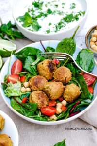Selbst gemachte Falafel mit Blattspinat-Salat und Minzjoghurt
